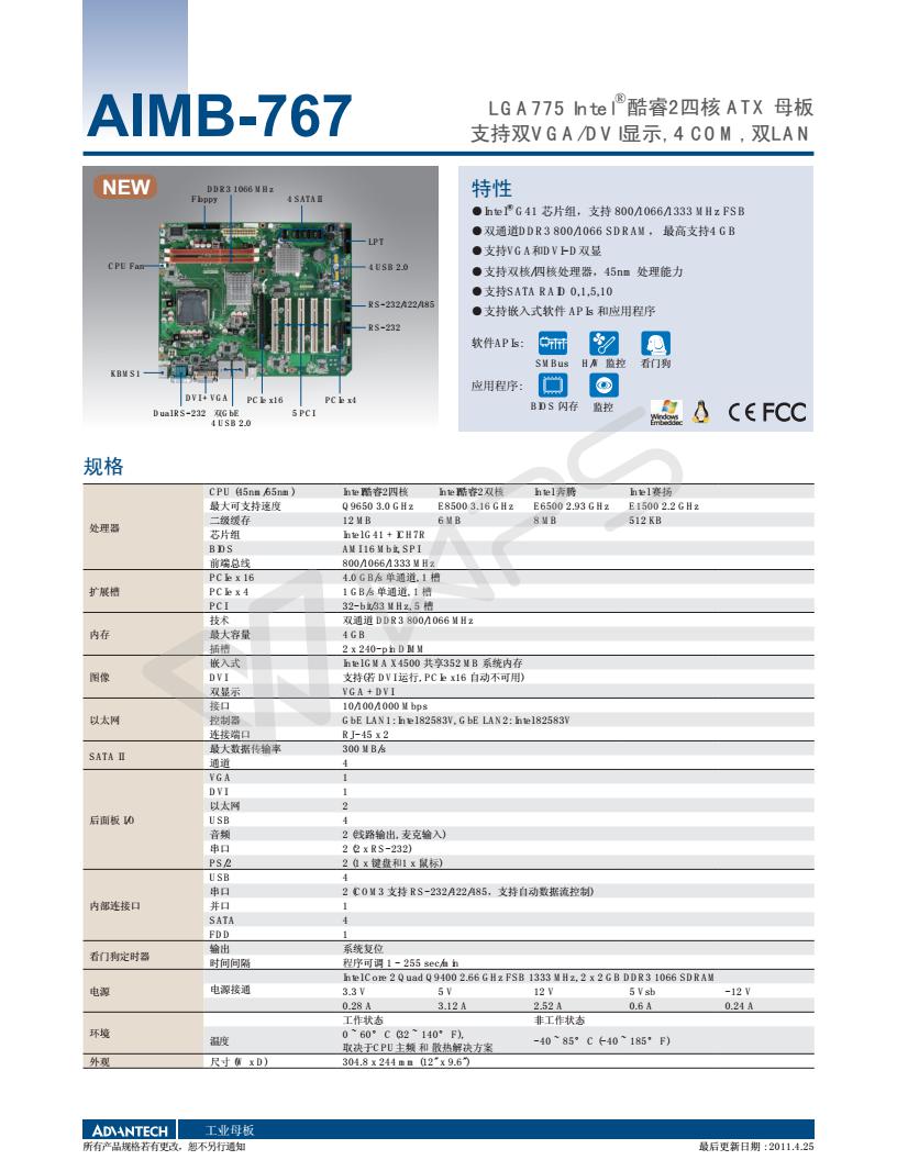 LGA775 Intel? 酷睿2 四核ATX 母板,支持雙VGA/DVI顯示, 4 COM, 雙LAN